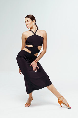 Długa sukienka, posiada ciekawe rozwiązanie konstrukcyjne, które podkreśla krągłości talii tancerki. Wycięcia po bokach sukienki nadają jej oryginalności i dodają szczypty seksualności, która jest istotna podczas występów scenicznych.