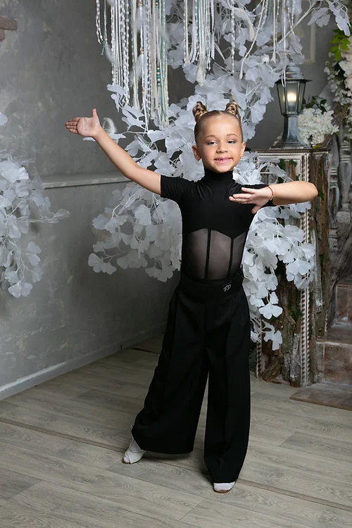 Body dziecięce przeznaczone do standardu i łaciny. Posiada nietypowy krój, który podkreśla talię, imitując gorset, i dodaje szczególnego uroku. Kołnierzyk typu stójka dodaje szyi elegancji. Body wykonane jest z wysokiej jakości jerseyu, składającego się w 95% z poliestru i 5% z lycry. Rozciągliwość tkaniny jest średnia i może wzrosnąć do 4 cm. Zapięcie body znajduje się na szyi i wykonane jest w formie guzików.