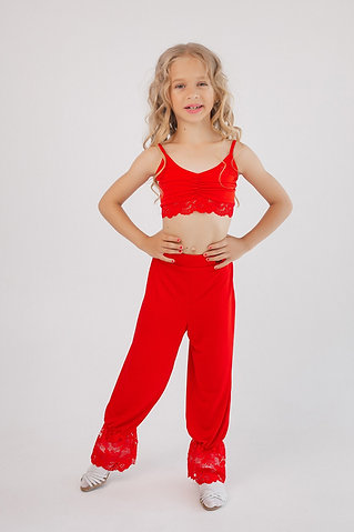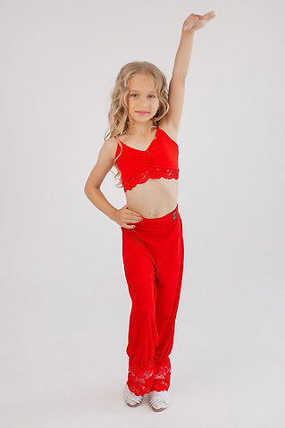 Dzianinowe spodnie dziecięce to stylowy i wygodny model do standardu. Posiadają wysoki stan oraz marszczoną koronkę u dołu nogawek, co nadaje temu modelowi elegancji i wdzięku. Dodatkowo potrafią podkreślić talię i dodać pewności na parkiecie.