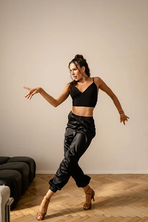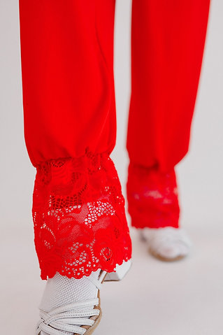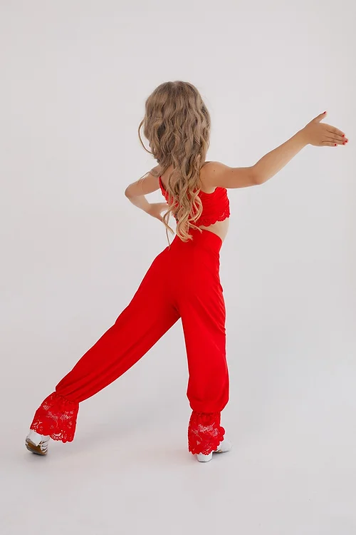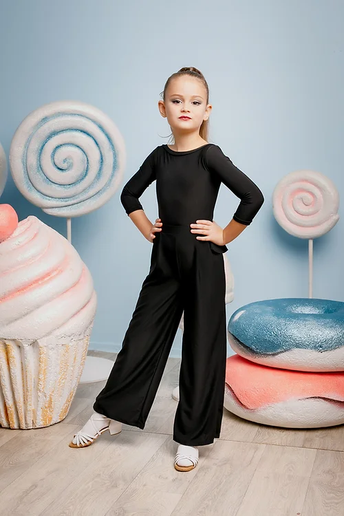 Dzianinowe spodnie dziecięce to stylowy i wygodny model do standardu. Posiadają wysoki stan oraz marszczoną koronkę u dołu nogawek, co nadaje temu modelowi elegancji i wdzięku. Dodatkowo potrafią podkreślić talię i dodać pewności na parkiecie.