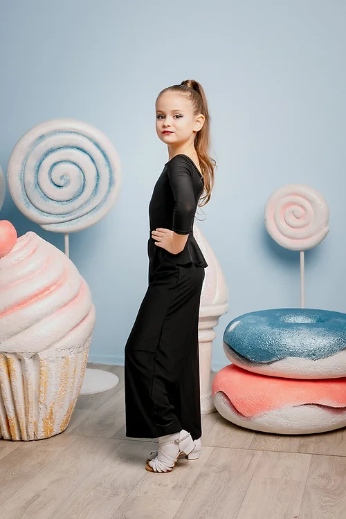 Dzianinowe spodnie dziecięce to wygodny model na zajęcia ze standardu. Posiadają szeroki krój i gumkę w pasie, która zapewnia wygodę podczas ruchu i pozwala na swobodne wykonywanie elementów tanecznych.